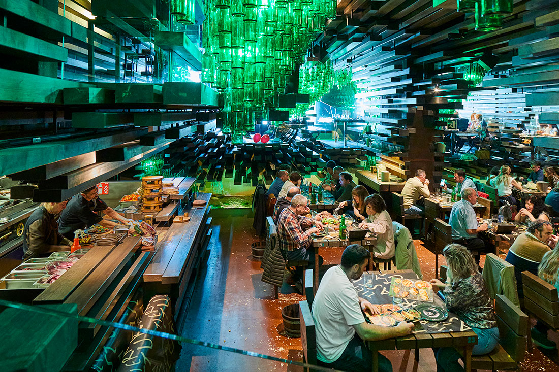 Tierra Astur es un auténtico ambiente asturiano, repartido en dos plantas. Aquí, las botellas de sidra verde cuelgan del techo sobre mesas y sillas de madera.