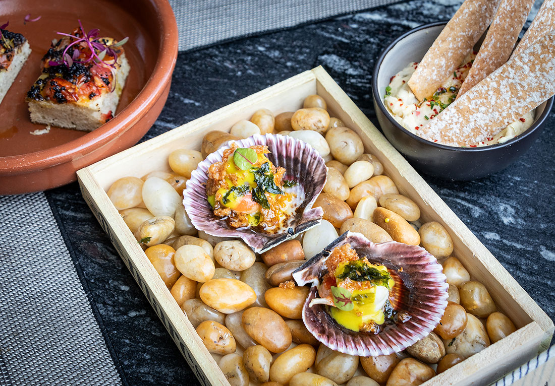 På restauranten får du fantastisk panoramaudsigt over landskabet og haverne, og her serveres dagligt morgenmad, ligesom der også er åbent til frokost, tapas og middag nogle dage i ugen.